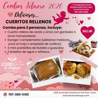 Los cueritos están rellenos de carne de cerdo y arroz a escoger entre arroz con gandules, mamposteao, arroz con longaniza y arroz con cebolla y tocineta. *Congrí nos disponible al momento. Los complementos también salen en bandejas para 2, 4, 12 y 20 personas.